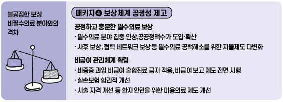 의료인 보호를 위해 형사처벌 특례법 체계를 도입하고 보험 공제기반 민사소송 및 고액부담을 완화시킬 예정입니다. '의료사고처리 특례법'제정을 추진해, 필수의료업무상 과실치사상죄 감면 방안은 아직 검토중이지만 의료사고 대상 공소제기를 제한하려는 시도를 하고 있습니다. 적용범위에 환자 사망사고나 미용성형수술포함 여부는 아직 논의중이라고 합니다.
